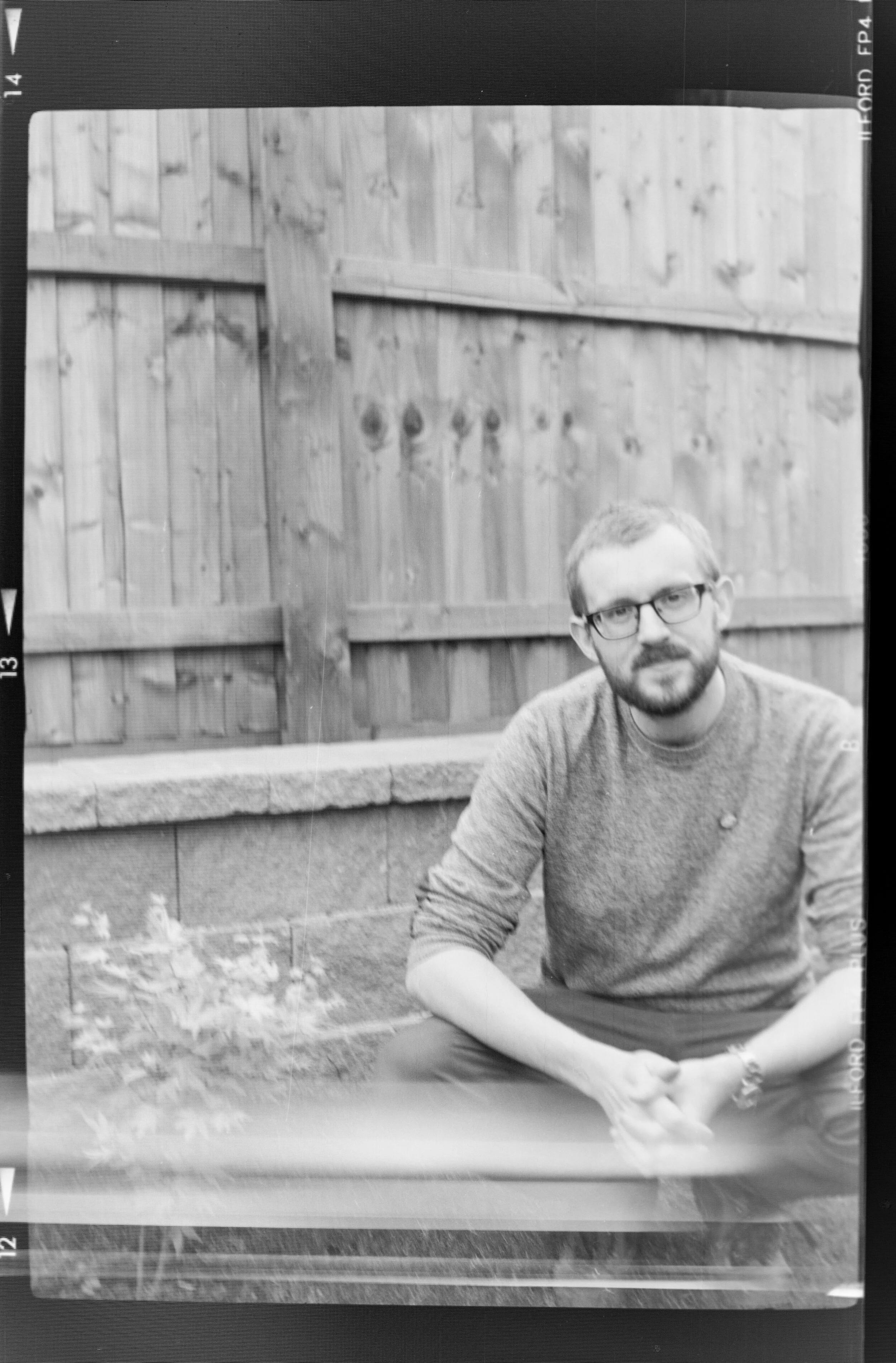 Crouched by the acer tree planted on my 30th birthday :). Shot by Jess. Shot at f/6.3, 1/50s, ISO 125 film, handheld in overcast light.